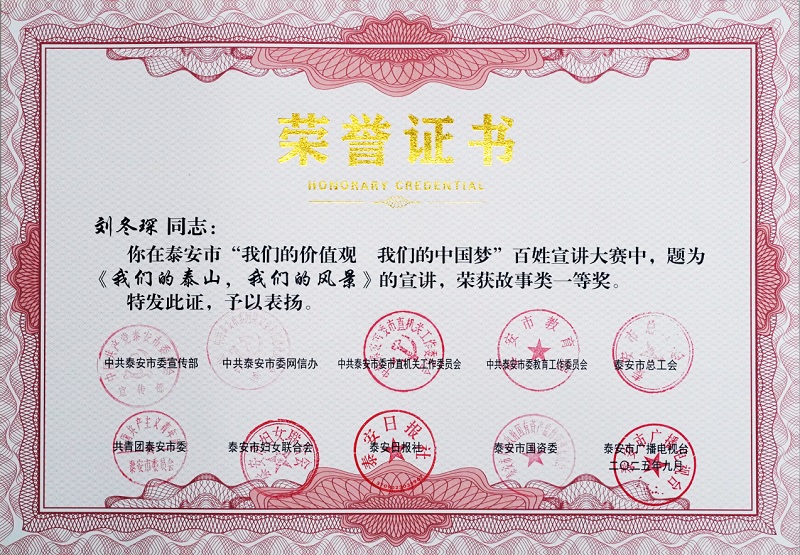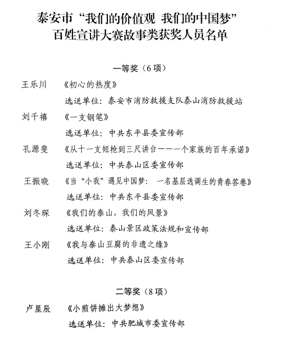 近日,中共泰安市委宣傳部等多部門聯(lián)合主辦的泰安市“我們的價值觀我們的中國夢”百姓宣講大賽結(jié)果公布,泰山文旅集團子公司泰山出品公司職工劉冬琛,憑借題為《我們的泰山,我們的風景》的宣講,榮獲故事類一等獎。